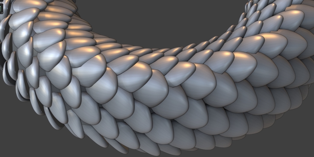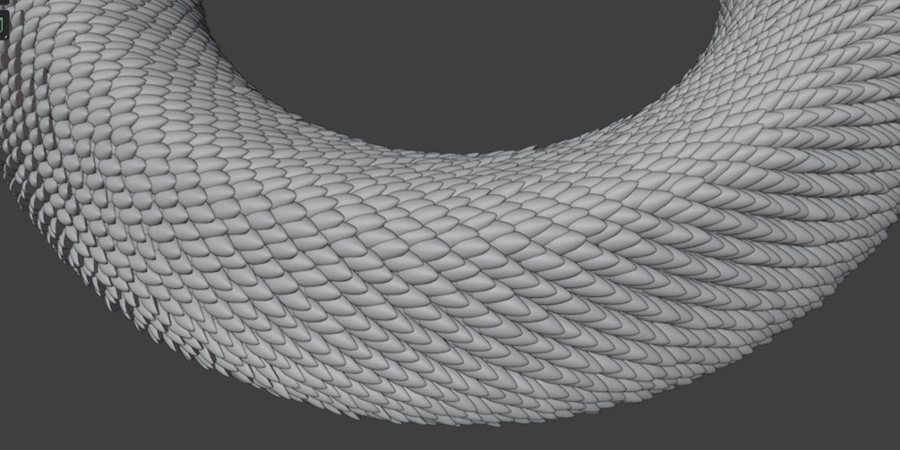 The meshes also have 2 generated UVs. One with the projection of the surface UV and another one for each individual scale.